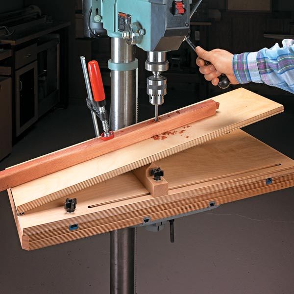 Он позволяет очень быстро и надежно прижимать к столику мелкие детали при сверлении. Во многих случаях это удобней, чем пользоваться тисками.