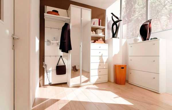 Наиболее часто в нашей стране прихожие являются собой комнаты-тамбуры, которые имеют весьма ограниченный размер. Самым лучшим решением для хранения одежды и обуви будет установка шкафа-купе, занимающего всю стену и включающего в себя гардероб и хранилища для зонтиков, сумок, головных уборов и прочего.
