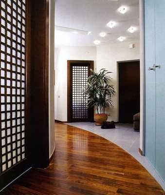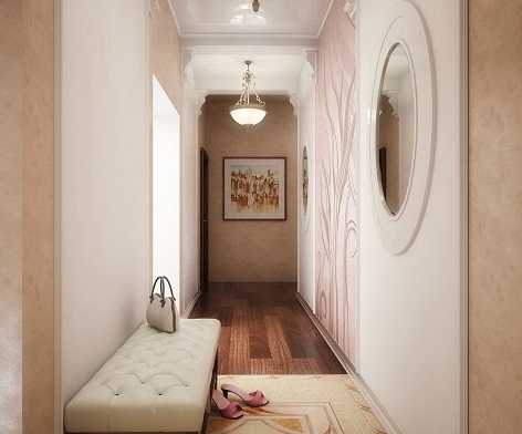 Прихожая-коридор обычно, очень узкая. Мебель в ней можно установить только вдоль одной стены. Узкую и обычно длинную прихожую желательно всегда разделять на некие зоны, с помощью арок или цветовой палитры. Отдельно выделить место под вешалки для верхней одежды, отделить входную дверь, организовать зону для зеркал. Благодаря таким приёмам можно оптимизировать пространство прихожей. Возле входной двери идеальным вариантом будет плиточный пол, а дальше можно застелить его другим материалом, например, линолеумом или ламинатом, укладывая его поперёк комнаты. Продольные стены стоит сделать светлых цветов, а торцевые более темных. И главное — зеркала, они помогут расширить узкое помещение, если их повесить на длинных стенах.