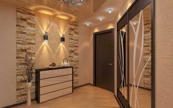 Особое внимание нужно уделить освещению. Дело в том, что правильно подобранные осветительные приборы способны творить чудеса. Светильники помогут вам визуально расширить пространство прихожей, сделать комнату более просторной и светлой. Рекомендуется обратить внимание на многоуровневое освещение, состоящее из центральной люстры, бра и однотипных светильников с направленным светом. Последние варианты нужно устанавливать рядом с зеркалом.