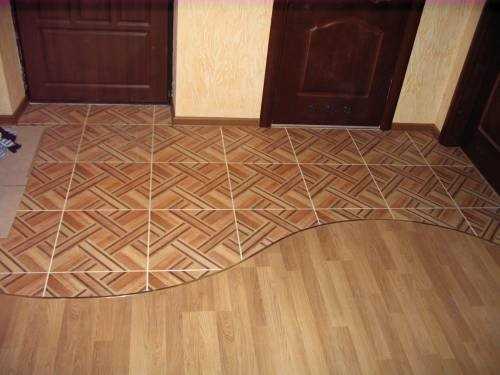 - Что касается паркета или ламината, в прихожей их лучше не использовать либо покупать влагостойкие модели. Как вариант, можно сделать зону у двери из плитки, а на остальную площадь уложить ламинат.