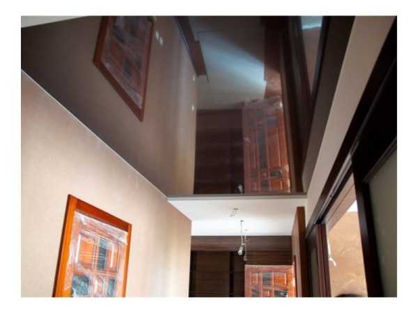 В коробочке органично смотрится зеркальный или блестящий натяжной потолок. Однако в длинном узком или извилистом коридоре он создает эффект колодца, потому при такой планировке он не подойдет категорически.