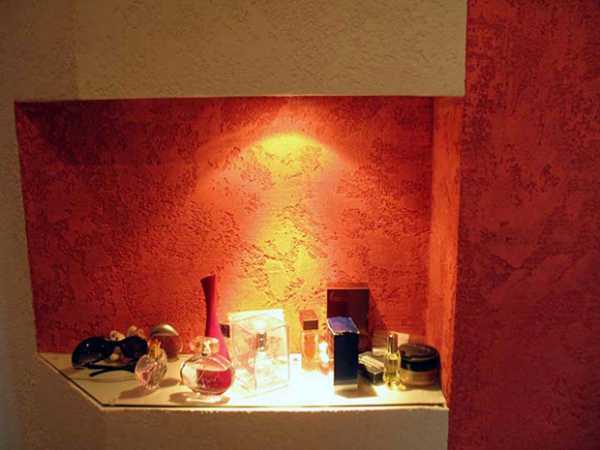- Очень красиво смотрятся полочки и ниши с подсветкой. Часто вместо задних стенок на них устанавливают зеркала, для увеличения визуального восприятия площади.