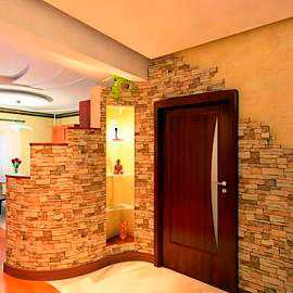 Ниши с подсветкой и отделка стен декоративным камнем- Оригинальные вставки из дорогих материалов: декоративной штукатурки, искусственного камня, керамогранита, деревянного или другого сайдинга.