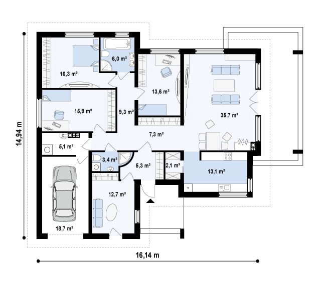 Подробнее Проект одноэтажного дома 16×6 метров, общей площадью 51 м2, из кирпича, c гаражом и террасой