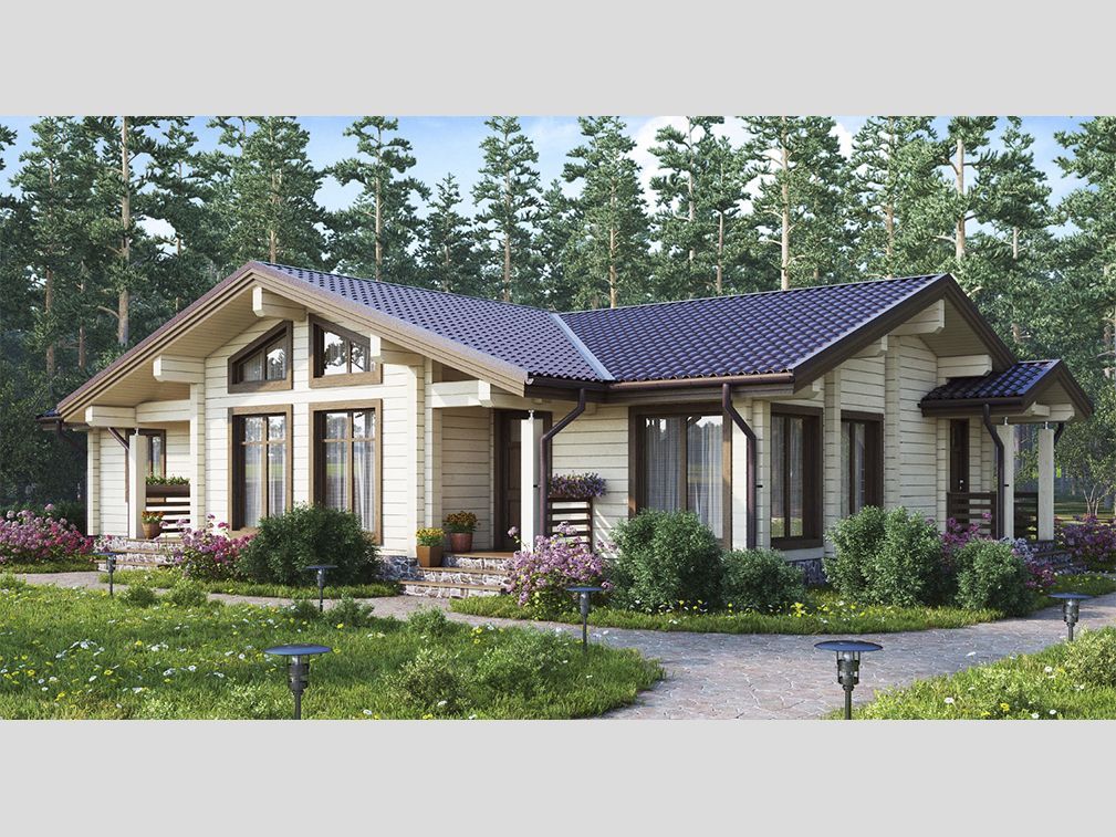 Проект одноэтажного дома из клееного бруса понравится тем, кто хочет построить небольшой загородный дом. Его центром станет просторная гостиная-столовая, совмещенная с кухонной зоной. Дом подкупает большой площадью остекления и наличием огромной террасы, на которой поместится и обеденный стол, и зона отдыха, и даже бассейн при желании.