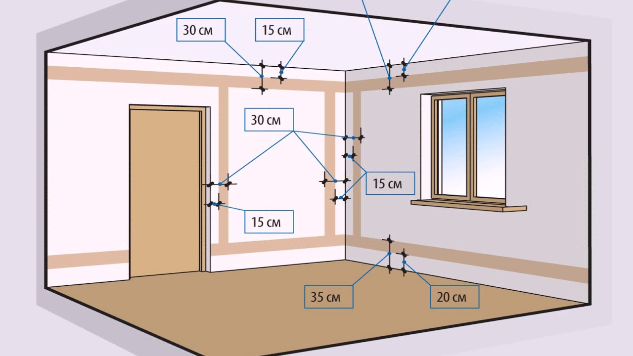 Если планируется укладка проводов вовнутрь стен, то следует отступать от перекрытий и проемов 15 – 20 см.