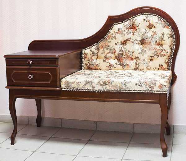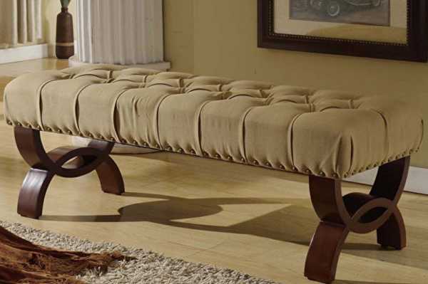 - Классическая скамейка. Такие конструкции с длинными резными ножками и дорогой текстильной обивкой превращают простую мебель в изысканный элемент интерьера.