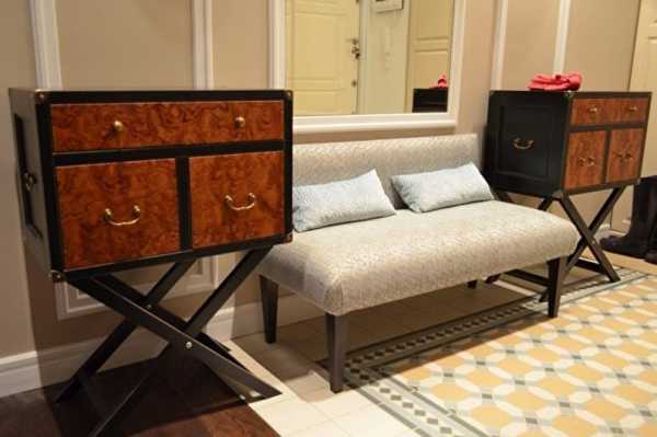 - Дерево и кожа. Стильная и лаконичная конструкция из дерева, обитая кожей, отлично вписывается в любой интерьер. Изготавливается как на длинных ножках без короба для обуви, так и на низких с дополнительными полочками или ящиками.
