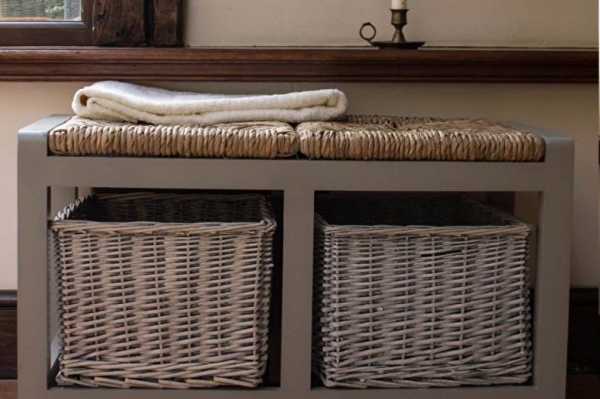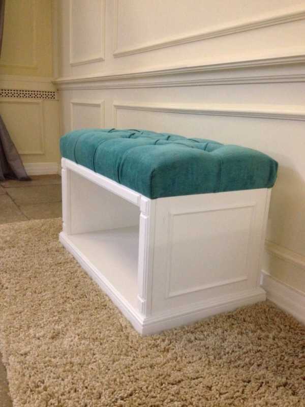 - Пуф в виде банкетки или скамейки. Если увеличить размеры конструкции, ее функциональность также возрастает. Хорошим вариантом для оформления прихожей является пуф в виде скамейки или дивана без спинки с полками для обуви. Такую конструкцию можно изготовить и самостоятельно из старых деревянных ящиков.