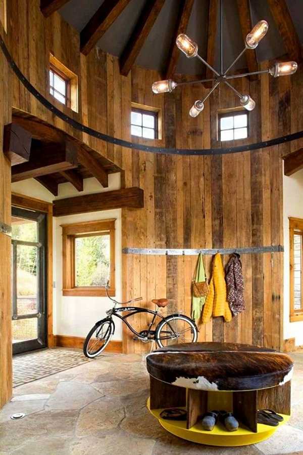 Как правило, обувница в прихожую в виде пуфа изготавливается из дерева. При этом могут использоваться как классические сочетания дерева и кожи или текстиля, так и необычные конструкции, которые позволяют собрать пуфик в прихожую своими руками практически из мусора.