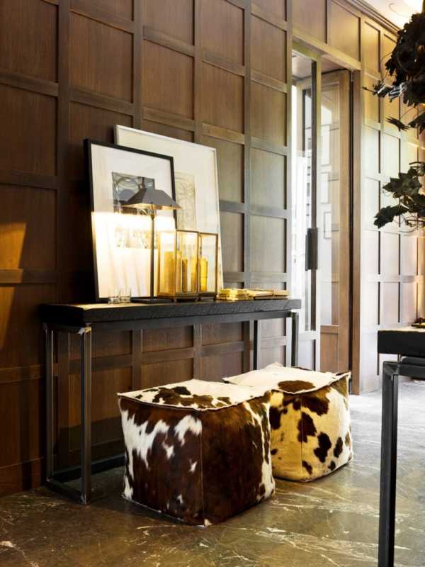 Оригинальные и современные пуфы в прихожую классифицируются еще и по конструкции. Существуют пуфы с открытым каркасом из металла или дерева и модели со скрытым каркасом при помощи декоративной юбки из ткани или других материалов.