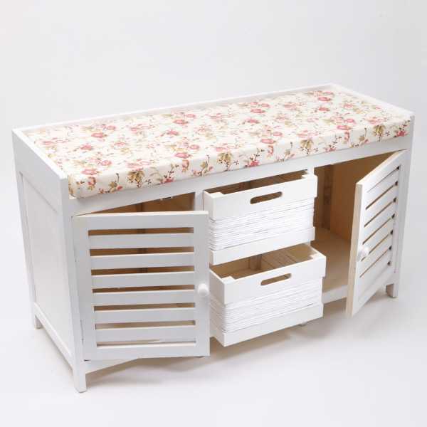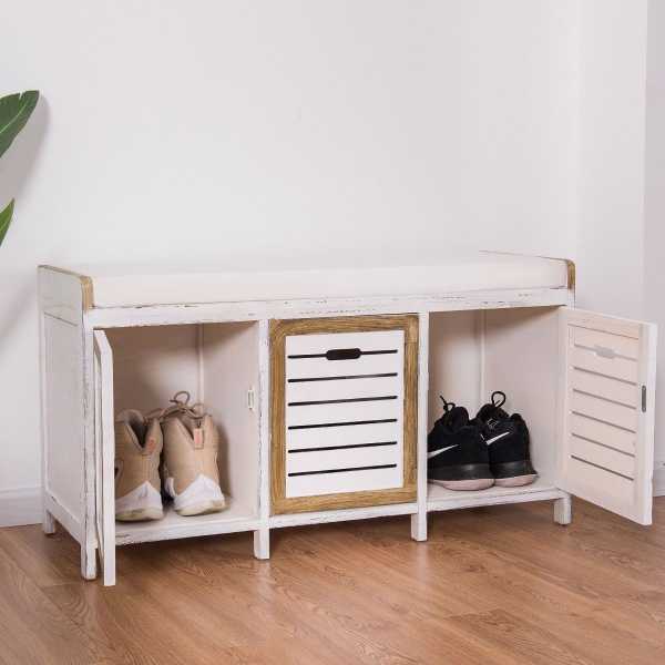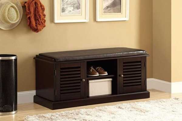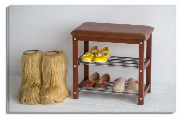 - Скамейка с дополнительной полкой для обуви. Позволяет получить максимум функциональности и удобства. Такой пуф можно соединить с тумбой, получив полноценную прихожую.