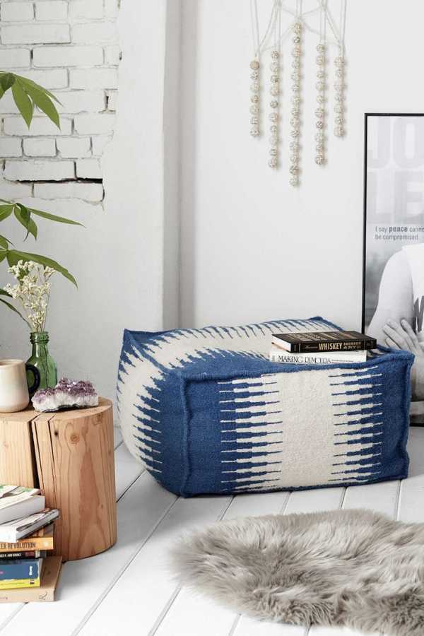 Стиль этно предполагает использование геометрических принтов и оригинальных рисунков. Интересно смотрятся пуфы с искусственно состаренным материалом. Форму пуфа нужно выбирать в зависимости от дизайна прихожей и личных предпочтений.