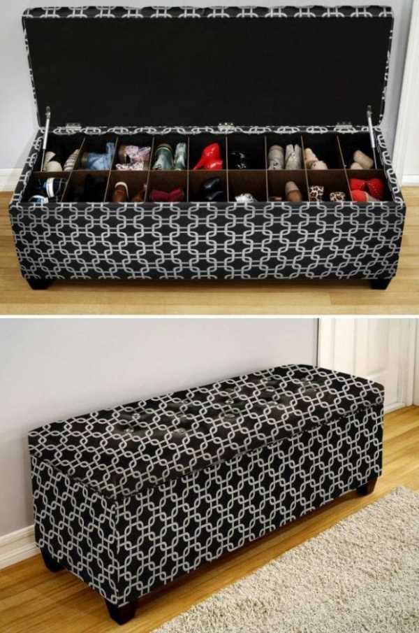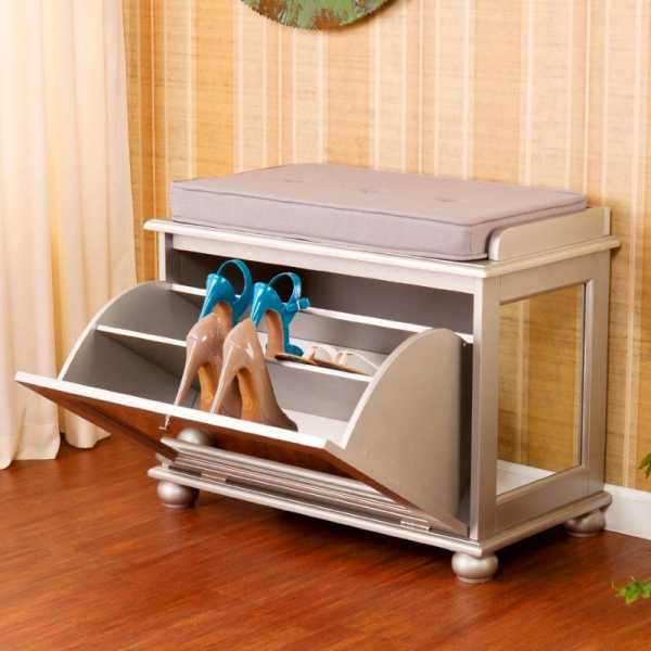 Пуфик с отделением для обуви.Существуют разнообразные виды этой меблировки с возможностью их применения в любой комнате, в самом различном убранстве. Практически каждый, располагающий в своей прихожей данным атрибутом, утверждает, что он эргономичен в плане использования и порой бывает незаменим.