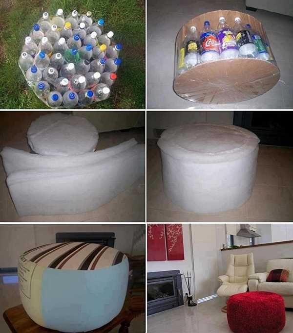 В интернете можно найти множество мастер-классов по созданию красивого пуфика для прихожей своими руками. Но самым популярным и креативным вариантом является пуф из пластиковых бутылок.