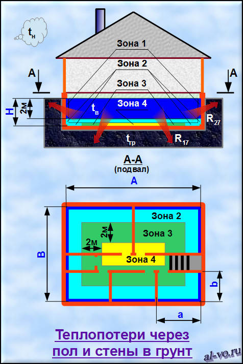 В чем смысл методики профессора А.Г. Сотникова? Он предлагает считать, что все теплопотери через пол заглубленного здания «уходят» в глубь планеты, а все потери тепла через стены, контактирующие с грунтом, передаются в итоге на поверхность и «растворяются» в воздухе окружающей среды.