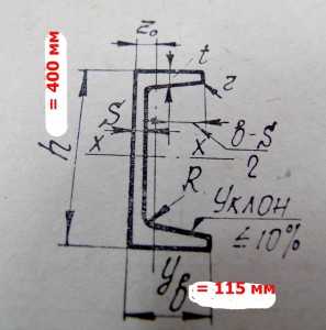 Для швеллера 40 с уклоном внутренних граней, шириной 400 мм и высотой 115 мм, толщина швеллера определяется двумя величинами: S= 8.0 мм, t= 13.5 мм.