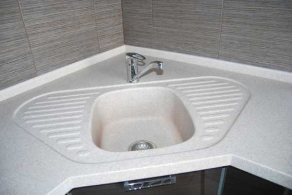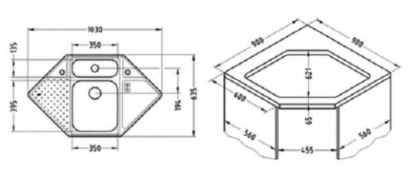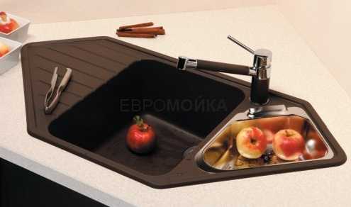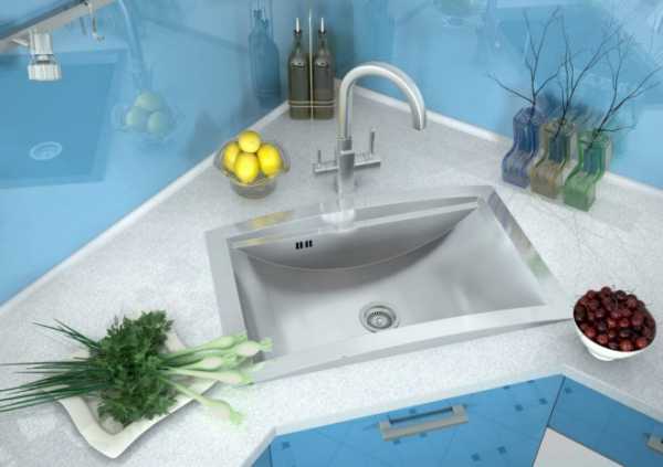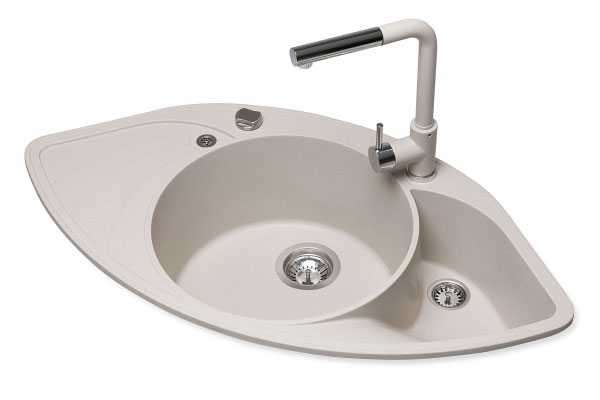 Угловые мойки устанавливают в кухонный гарнитур с угловыми базами, когда необходимо максимально использовать столешницу. В маленьких кухнях важен каждый сантиметр. Угловая мойка обычно имеет две чаши, размер которых позволяет одновременно мыть посуду и подготавливать продукты.