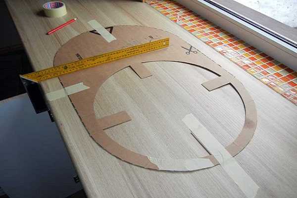 Чтобы вырезать отверстие в столешнице, на ней закрепляют шаблон с помощью малярного скотча, а затем обводят его по контуру карандашом. Затем от каждой стороны отступают 1,5 см и делают второй, рабочий чертеж, по которому и будет формироваться проем.