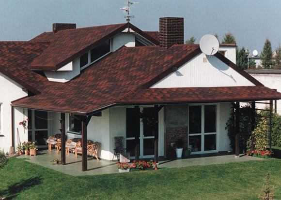 Мягкой черепицей можно перекрывать не только крыши домов, но и вертикальные примыкающие стеновые поверхности, а также использовать для реконструкции старых зданий.