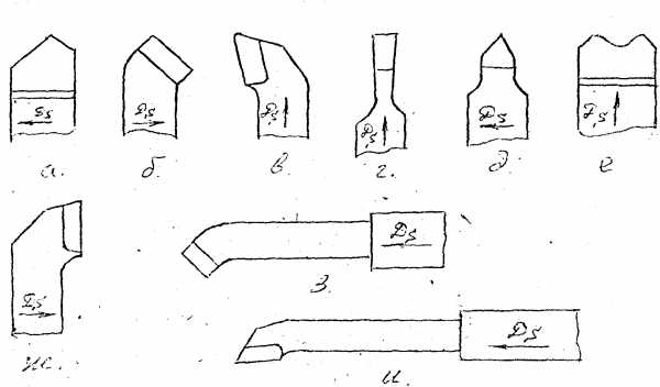 д — резьбовой, оттянутый;е — фасонный; ж — проходной упорный, левый, отогнутый;