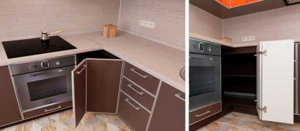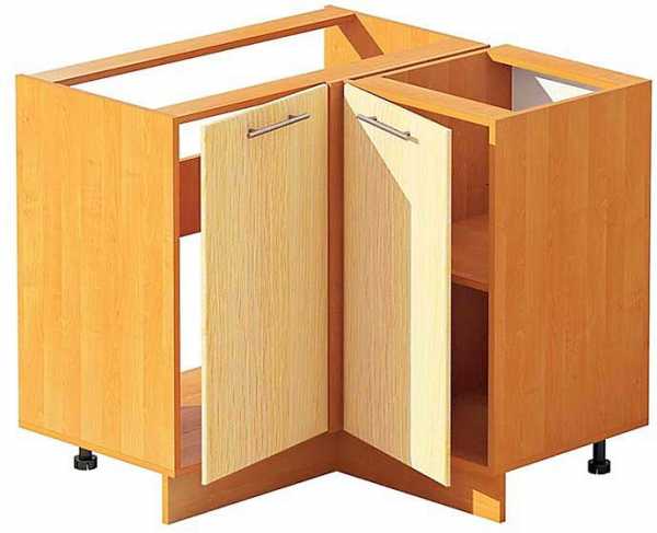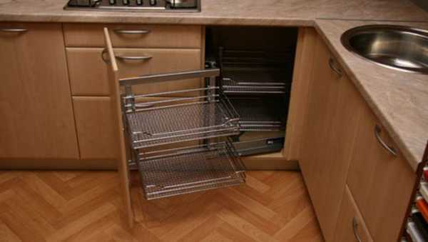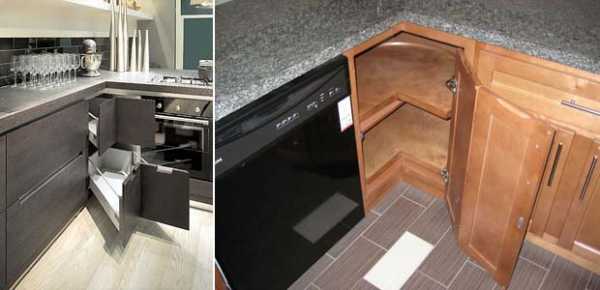 Трапециевидными. Формой похожи на угловые, но гораздо объемнее. Их можно приспособить для хранения кухонной утвари.