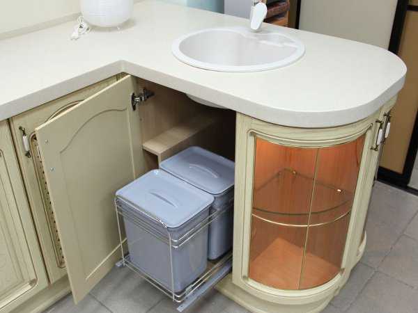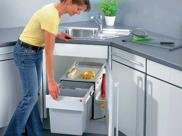 Сегодня российская мебельная промышленность переняла у зарубежных производителей крепление мусорного ведра на дверной створке. При открытии дверки крышка ведра приподнимается, предоставляя хозяйке свободный доступ к его внутренностям. Не менее удобно крепление мусорного контейнера на салазках. При этом он может выдвигаться при открывании дверной створки.
