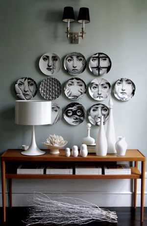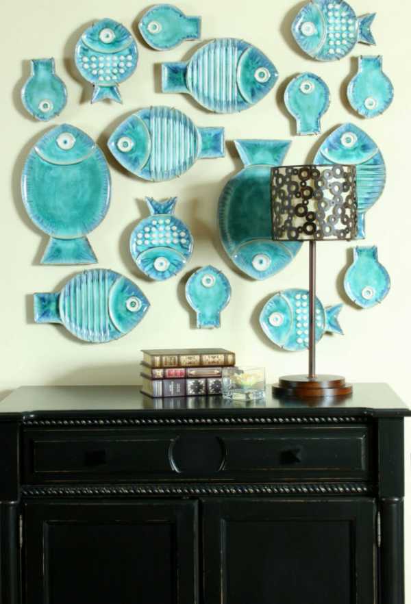 Эффектный способ преображения пустующей стены – составление композиций из декоративных тарелок. Тарелки могут составлять единый стиль, к примеру ретро, минимализм, гламур или подчеркивать хобби хозяина дома, тогда при выборе тарелок необходимо подбирать все предметы в единой образцово-показательной направленности с изображением – киногероев, путешествий, гор, морей и т.д. Более подробно о составлении композиций из декоративных тарелок можно почитать в этом обзоре.
