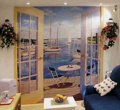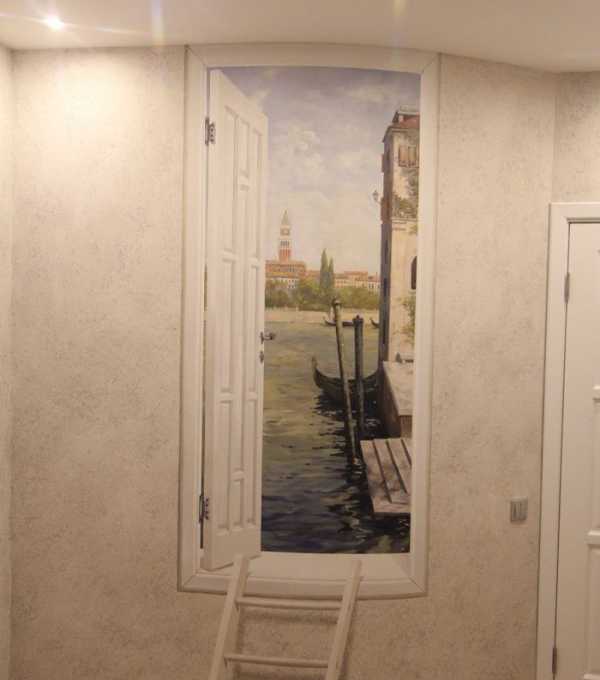 - Нарисованная дверь или «открытый» выход на природу. Прием, доступный художникам, но можно ограничиться фотообоями с аналогичным сюжетом.