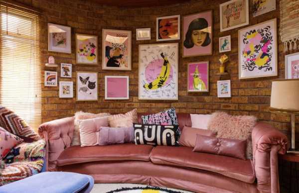 Интересный способ — развесить работы вплотную друг к другу и отказаться от рамок — получается ощущение разноцветных пэчворк-обоев.