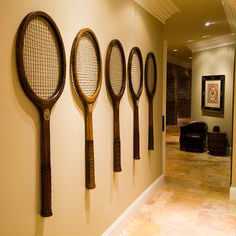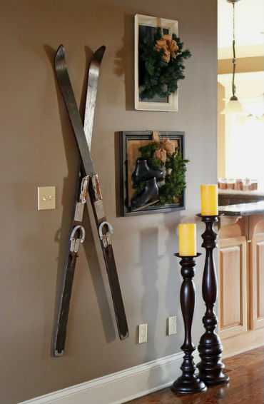 Отличным решением для декора стен может послужить ненужный спортивный инвентарь: тенистые ракетки, лыжи, коньки или сноуборды. Хотя, в принципе на стенах можно закрепить и эксплуатируемый спортивный инвентарь, таким образом решится вопрос с его хранением, красиво и практично.