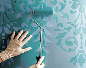 После того как шаблон будет готов, его нужно закрепить на подготовленной стене. Сделать это можно с помощью двухстороннего скотча. Прокрашивать свободные места удобнее всего валиком или губкой. При нанесении краски с помощью кисти возможно затекание под картон, а это значит, что точность линий будет нарушена.
