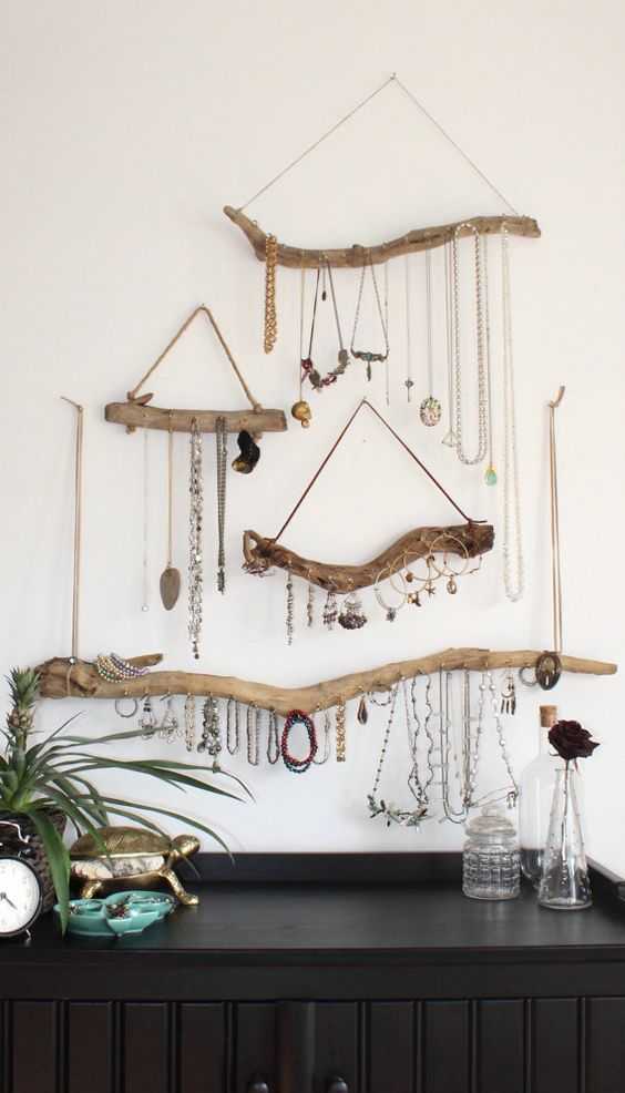 - Природные элементы могут быть одновременно настенным декором и функциональным предметом, например, вешалки из оленьих рогов или оригинальных сучков.