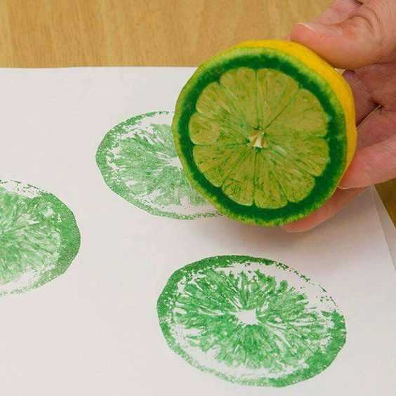 | 3. | Рисуем оттисками или отпечатками | Макаем в краску срез лимона или красивый осенний листик, фактурный валик или специально подготовленную резную заготовку. |