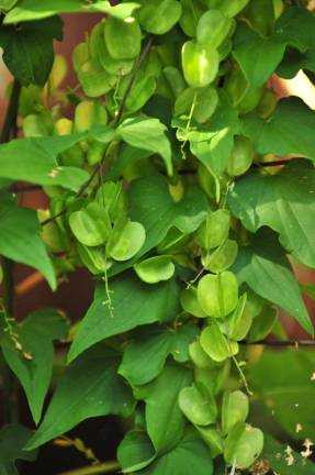 Диоскорея ниппонская (Dioscorea nipponica). Эта вьющаяся многолетняя травянистая лиана появилась в нашем саду в 1989-м году. Растение привлекает многими качествами. На первом месте, пожалуй, ее своеобразный облик. Листья диоскореи имеют необычное для наших растений пальчатое жилкование. Они имеют остро оттянутые верхушки и располагаются на лиане капельницами вниз. Черепитчато накладываясь друг на друга, они образуют плотную и весьма декоративную листовую мозаику. При этом листовые пластинки направляют дождевые осадки в область залегания короткого клубневидного корневища. Цветки у диоскореи очень мелкие, невзрачного зеленовато-желтого цвета. Плоды — трехгнездные коробочки длиной около 15 мм. Побеги тонкие, малоразветвленные, длиной до 2,5 м.