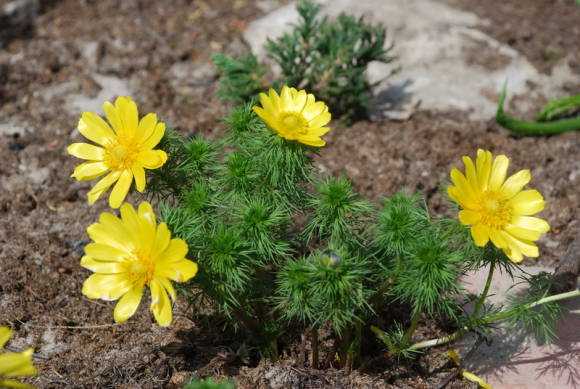 Адонис весенний, горицвет (Adonis vernalis). Просто удивительно, почему адонис до сих пор является редким гостем в российских палисадниках, тем более что по происхождению он россиянин. Этот цветок из семейства лютиковых дико произрастает в лесостепной и степной зоне Европейской части России. Необыкновенно яркие и крупные цветки адониса никого не оставят равнодушным. Уже одни они — повод пригласить этот травянистый многолетник в палисадник. Но кроме этого, адонис является ценным лекарственным растением, за что уже изрядно поплатился своей численностью в природе.
