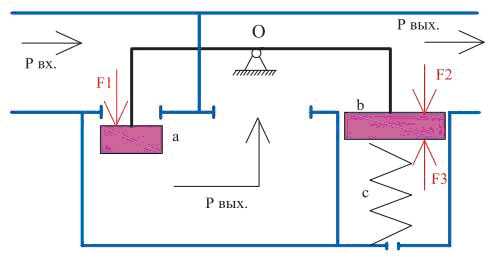 Принцип действия квартирных регуляторов давления основан на уравновешивании усилий, создаваемых давлений на входе и выходе за счет отношения площадей, на которые воздействуют эти давления (рис. 3). Давление на входе рвх воздействует на малый поршень, стремясь его открыть. За счет дросселирования в золотнике, связанным с малым поршнем, давление уменьшается до pвых. Это пониженное давление воздействует на большой поршень, стремясь закрыть золотник.