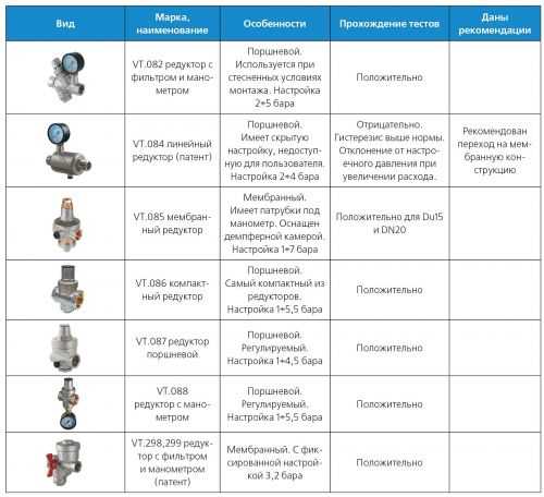 Однако не только точность определяет пригодность редуктора давления для работы в качестве квартирного регулятора. Производители регуляторов давления, как правило, выпускают достаточно широкую линейку редукторов, как мембранных, так и поршневых, конструктивно отличающихся друг от друга пропускной способностью, диапазонами настройки, максимальным коэффициентом редукции, дополнительными опциями и пр. Для примера, в таблице 1 приведены типы регуляторов давления, выпускающихся под торговой маркой VALTEC.