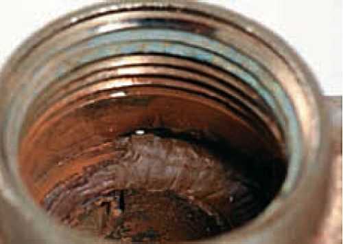 Рис. 6. Кавитационное разрушение золотниковой обоймы редуктораРяд производителей выполняют седло клапана с кольцом из нержавеющей стали, что, по их утверждению, надежно защищает редуктор от последствий кавитации. Но эта мера никак не защищает зону, прилегающую к седлу и стенкам корпуса редуктора.