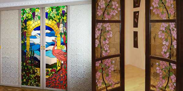 Для любителей статусных интерьеров дизайнеры предлагают межкомнатные витражные двери 2019. Они идеально подходят помещениям, отделанным в стиле Модерн, отделяя гостиную от коридора. В моде и двери со вставкой из стекла, которая может быть украшена изящным кованым «кружевом».