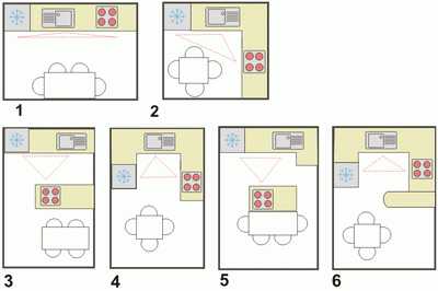 ΠΡΠ»ΠΈ ΠΊΡΡ Π½Ρ ΠΌΠ°Π»Π΅Π½ΡΠΊΠ°Ρ, ΡΠΎ Π² ΠΎΠ΄ΠΈΠ½ ΡΡΠ΄ Π²ΡΡ ΠΌΠ΅Π±Π΅Π»Ρ Ρ ΡΠ΅Ρ Π½ΠΈΠΊΠΎΠΉ ΠΌΠΎΠΆΠ΅Ρ Π½Π΅ ΠΏΠΎΠΌΠ΅ΡΡΠΈΡΡΡΡ. Π ΡΡΠΎΠΌ ΡΠ»ΡΡΠ°Π΅ Π»ΡΡΡΠ΅ ΠΈΡΠΏΠΎΠ»ΡΠ·ΠΎΠ²Π°ΡΡ ΡΠ³Π»ΠΎΠ²ΠΎΠΉ ΡΠΈΠΏ ΡΠ°Π·ΠΌΠ΅ΡΠ΅Π½ΠΈΡ ΠΌΠ΅Π±Π΅Π»ΠΈ. ΠΡΠΈ ΡΡΠΎΠΌ Π²Π°ΠΆΠ½ΠΎ ΡΡΠΈΡΡΠ²Π°ΡΡ, ΡΡΠΎ Π΄Π»ΠΈΠ½Π° Π²ΡΠ΅Ρ ΡΡΠΎΡΠΎΠ½ ΡΠ°Π±ΠΎΡΠ΅Π³ΠΎ ΠΏΡΠΎΡΡΡΠ°Π½ΡΡΠ²Π° Π΄ΠΎΠ»ΠΆΠ½Π° Π±ΡΡΡ ΠΎΡ 3 Π΄ΠΎ 6 ΠΌΠ΅ΡΡΠΎΠ² β ΡΡΠΎ ΠΎΠΏΡΠΈΠΌΠ°Π»ΡΠ½ΡΠ΅ Π·Π½Π°ΡΠ΅Π½ΠΈΡ, ΡΡΠΎΠ±Ρ ΠΈ ΠΌΠ΅ΡΡΠ° Π±ΡΠ»ΠΎ Π΄ΠΎΡΡΠ°ΡΠΎΡΠ½ΠΎ, ΠΈ ΠΌΠ½ΠΎΠ³ΠΎ Π΄Π²ΠΈΠΆΠ΅Π½ΠΈΠΉ Π½Π΅ ΠΏΡΠΈΡΠ»ΠΎΡΡ Π±Ρ Π΄Π΅Π»Π°ΡΡ, Π·Π°Π½ΠΈΠΌΠ°ΡΡΡ ΠΏΡΠΈΠ³ΠΎΡΠΎΠ²Π»Π΅Π½ΠΈΠ΅ΠΌ Π΅Π΄Ρ. Π’Π°ΠΊΠΆΠ΅ ΡΠΏΠ΅ΡΠΈΠ°Π»ΠΈΡΡΡ ΡΠΎΠ²Π΅ΡΡΡΡ, ΡΡΠΎ ΡΠ°ΡΡΡΠΎΡΠ½ΠΈΠ΅ ΠΌΠ΅ΠΆΠ΄Ρ ΡΡΠΎΡΠΎΠ½Π°ΠΌΠΈ ΠΊΡΡ ΠΎΠ½Π½ΠΎΠ³ΠΎ ΡΡΠ΅ΡΠ³ΠΎΠ»ΡΠ½ΠΈΠΊΠ° (ΠΌΠΎΠΉΠΊΠ°, ΠΏΠ»ΠΈΡΠ°, Ρ ΠΎΠ»ΠΎΠ΄ΠΈΠ»ΡΠ½ΠΈΠΊ) Π΄ΠΎΠ»ΠΆΠ½ΠΎ Π±ΡΡΡ ΠΏΡΠΈΠΌΠ΅ΡΠ½ΠΎ ΡΠ°Π²Π½ΡΠΌ, ΠΈ Π½Π΅ Π±ΠΎΠ»Π΅Π΅ 1,85 ΠΌ.
