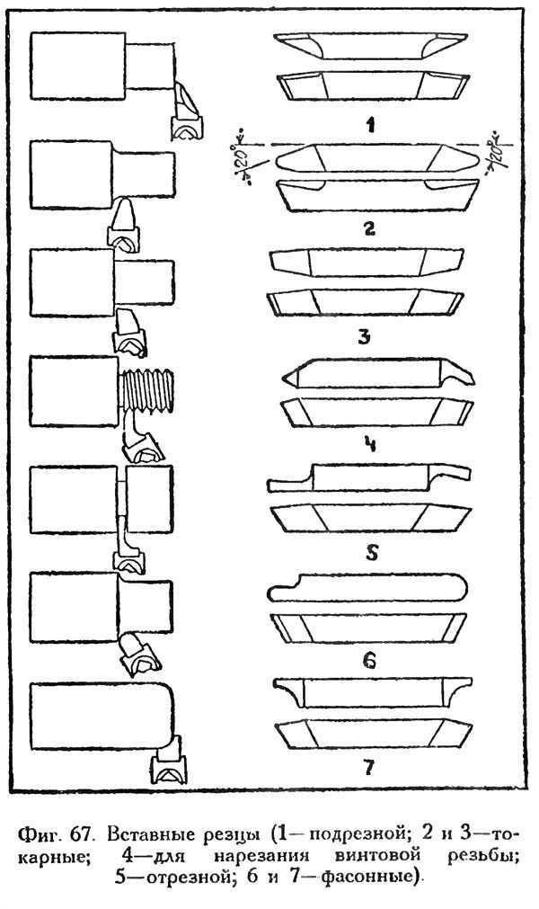 Токарный станок применяется для весьма разнообразных работ — для обточки, нарезки резьбы, расточки отверстий и т. д., причем для каждой операции требуются резцы особой формы. На фиг. 62 изображены различные типы кованных токарных резцов. Впрочем, в последнее время они постепенно вытесняются более экономичными резцами небольших размеров, вставляемыми в специальные державки (см. фиг. 66).