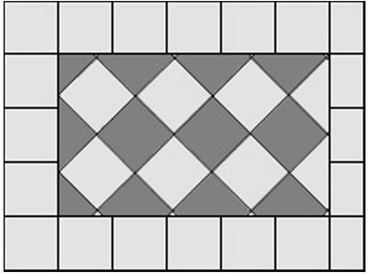 В этом рисунке укладки используются также два размера элементов. Прямоугольные плитки располагаются вокруг квадратной плитки в центре. Прямоугольный керамогранит должен быть такой же ширины, как и квадратный, но длиннее в два раза. Таким образом, получается рисунок как бы состоящий из 5-элементных квадратных модулей.