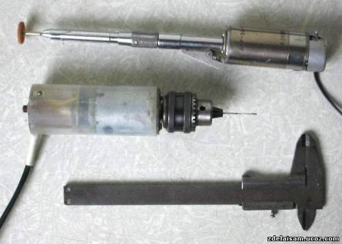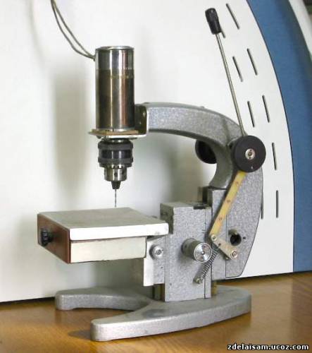 Если потребуется сверление с помощью вышеописанного станка заготовок большой толщины — лучше всего использовать мощный электродвигатель вместо дрели. Тогда обязательно устанавливается блок передачи крутящего момента.