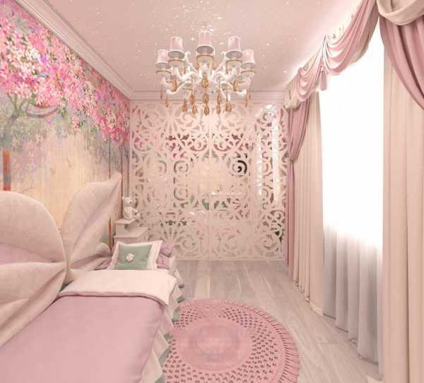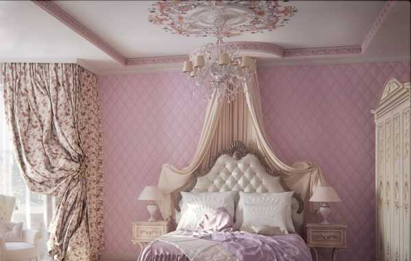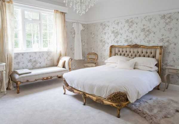 Люстры и настенные светильники должны быть в золотом цвете, мебель – в белом, а ковер, занавески, покрывало и изголовье постели – сочетать розовый и золотой цвет.