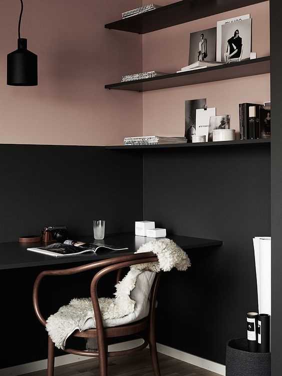 Если же вам, напротив, хочется более серьезного, солидного настроения в интерьере, возьмите за основу более строгие оттенки. Пыльно-розовый прекрасно чувствует себя в компании насыщенных темных цветов: графитового, синего, черного, коричневого. Количество комбинаций безгранично! Может быть, вы найдете собственное идеальное сочетание?