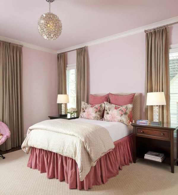 Ну а если перед вами стоит цель добиться дизайна в спокойном стиле, то можно оформить спальню целиком в бежевом цвете, а розовым — подметить определенные вещи. Например, напольный ковер, покрывало, занавески и пуф для туалетного столика в спальню.