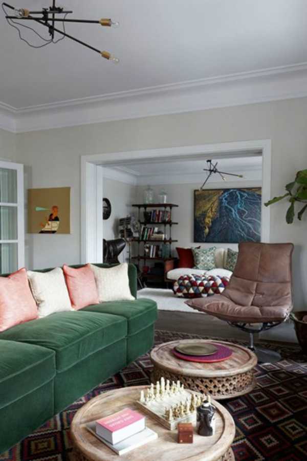 Коричневый, изумрудный, голубой цвета в паре с цветом пыльной розы придадут интерьеру гостиной нотки изысканости и утонченности.
