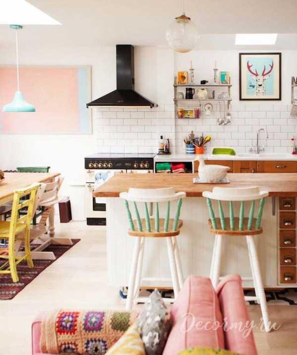 Для создания красочной кухни достаточно пластиковых стульев насыщенного цвета и дверцы шкафчика в тон. Дополнить этот минимум можно стеклянной столешницей, занавесками и салфетками соломенного, сиреневого или мятного тонов: получится милый, непринужденный, но вместе с тем достойный ансамбль.